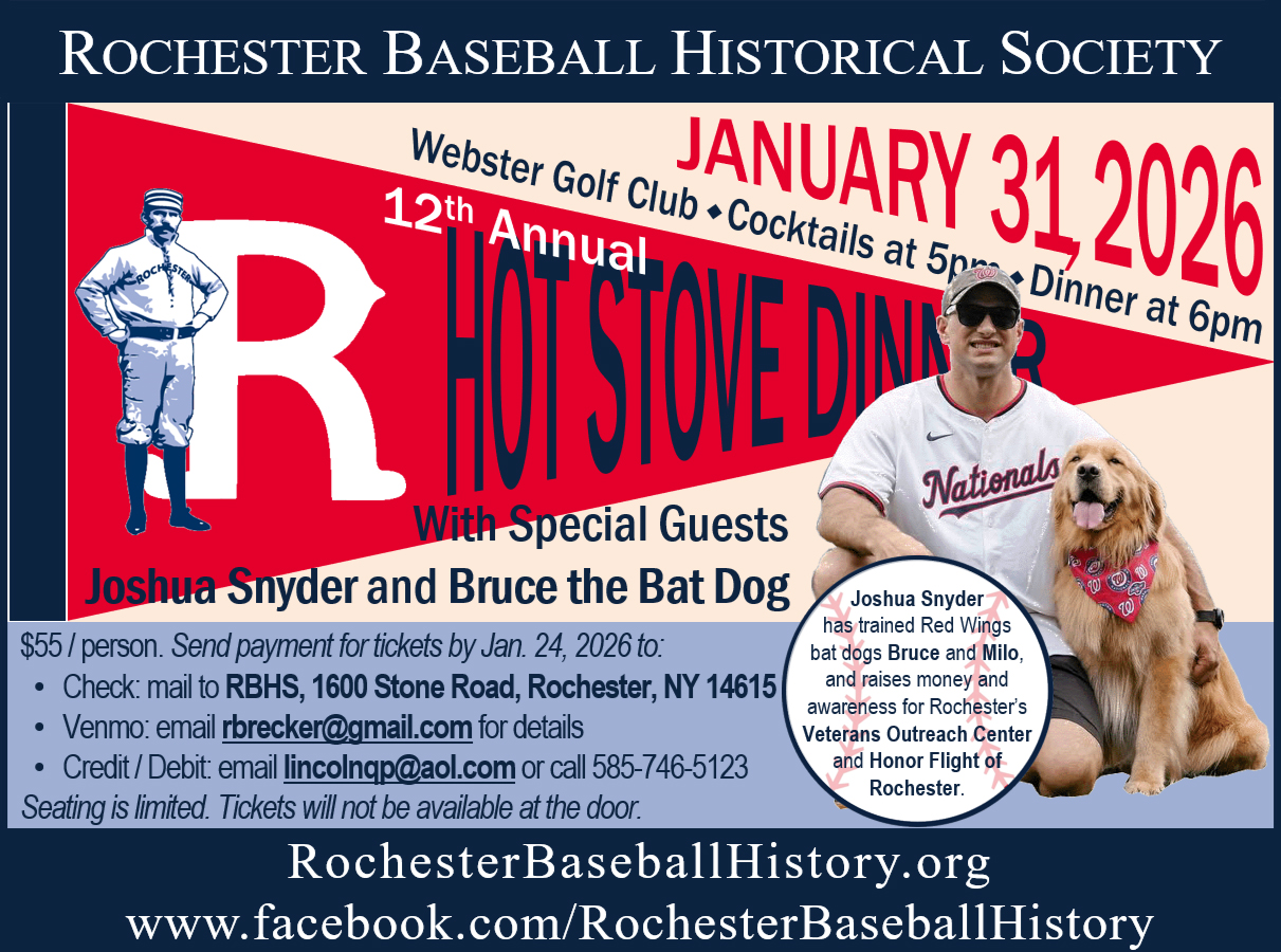The Rochester Baseball Historical Society’s annual Hot Stove Dinner has gone to the dogs – and that’s a good thing! Please join us Saturday, January 31st at Webster Golf Club as Bruce the Bat Dog and professional dog trainer Joshua Snyder entertain us with tales and tails. The past two seasons, Bruce followed in the paw steps of beloved golden retriever predecessor, Milo, fetching bats at Red Wings games. Under the guidance of U.S. Marine Corps veteran Snyder, Bruce and Milo’s appearances at Wings games have raised more than $50,000 for local charities.
